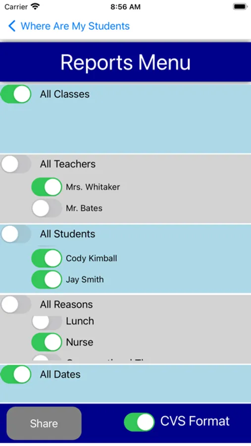 A complete reporting system will show how often Mary was in the Bathroom in October; Johnny was on family vacations; or Taylor was at the nurse’s office. Print, E-Mail or Text Message the reports . . . even export them to spread sheets.