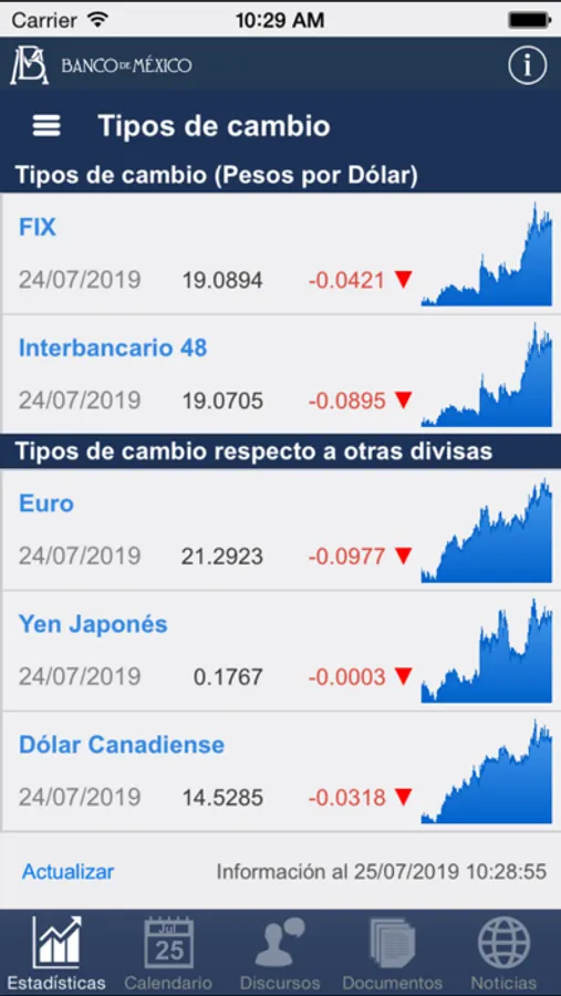 Después de acceder la información la primera vez, es posible consultarla aun cuando no se tenga conexión a Internet. Los indicadores económicos se muestran usando gráficas interactivas y tablas con los datos más recientes. Es posible leer los documentos en formato PDF dentro de la misma aplicación.
