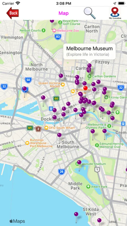 Map - The map is mainly centred around Melbourne and its suburbs. It uses four coloured pin-drops. Purple pins shows all 183 sights within Melbourne and around Victoria. Red pins shows the location of hotels you've entered, green pins shows the locations that you wish to find, and the blue pin shows your current location. When you are in Australia, the 'Locate' button will pin-point your current location with a blue pin-drop. There is also a 'Find' button that allows you to find an address or place that you've entered and this location is shown with a green pin-drop.