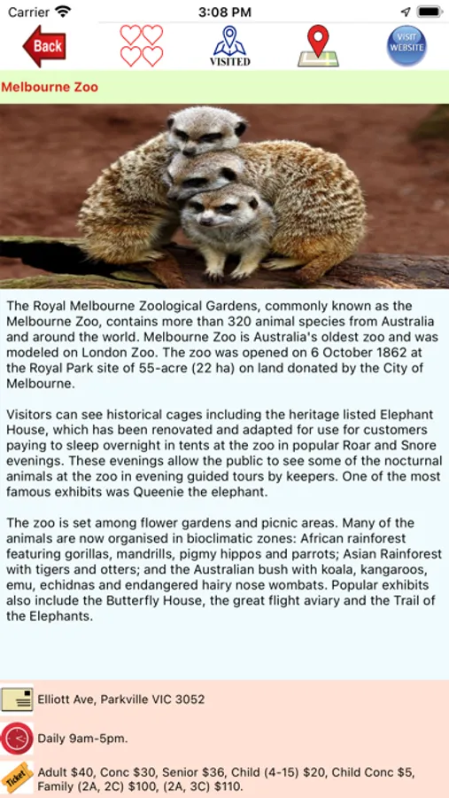 This app is designed specifically to assist visitors navigate around interesting sights within Melbourne city and its surrounds as well as places of interest around Victoria. There are 183 sights included in the app with purple pin-drops showing their locations on the map. Once your hotel details are entered, you can easily find what interesting sights are around the hotel you're staying through the map pin-drops. The app also allows you to check the weather conditions, send postcards to family and friends, enter your hotel information by keying in the address or obtain from your contacts, visitor information, modes of transport, and restaurants in Melbourne.