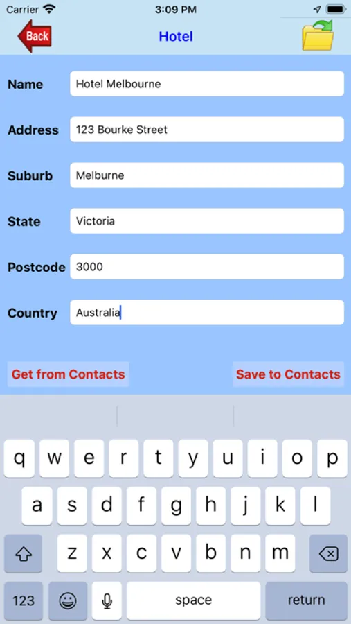 Hotels - You can enter the name and address of a hotel or get one from your Contacts. When you press the 'Save' button, the hotel will be shown on the map. This will provide an indication of how far the sights are from your chosen hotel address. More than one hotel addresses may be entered. You can then go back to the Map section to see the locations (shown by red pin-drops) of these hotels. You can also save the hotel details to your contacts.