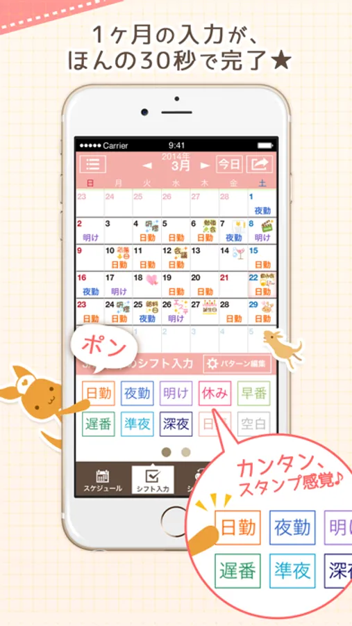 日付を選び、「日勤」「夜勤」「早番」などのスタンプをタップしていくだけ。