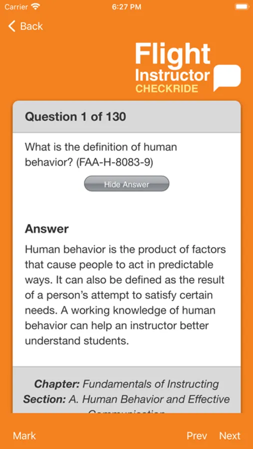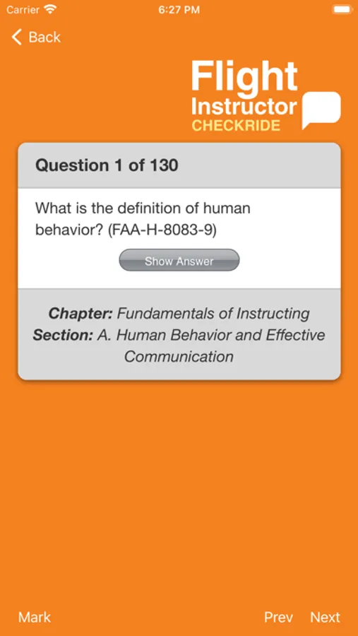 This Flight Instructor Checkride app is based on the popular Flight Instructor Oral Exam Guide book by Michael Hayes. It is designed for instructor applicants training for the Certified Flight Instructor (CFI) Certificate. Nearly 600 questions and responses ensure all the subjects a Flight Instructor candidate will be tested on during checkrides and review flights are covered. Topics include: fundamentals of instructing, flight instructor responsibilities, technical subject areas (such as runway incursion avoidance, scanning, navigation, logbook entries and certificate endorsements, etc.), takeoffs and climbs, fundamentals of flight, slow flight, stalls and spins, basic instrument maneuvers, performance maneuvers, ground reference maneuvers, approaches and landings, emergency operations, and scenario-based training. Answers and explanations were researched using FAA documents (which are identified so pilots know where to go for further study) as well as interviewing FAA examiners. Questions can be marked for further study from any subject to build your own collection of flashcards. An Applicant Practical Test Checklist and Advisory Circular (AC) 61-65H (Certification: Pilots, and Flight and Ground Instructors) are also included.