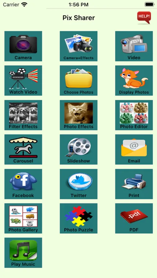 Choose Photos - Choose multiple photos from the photo album or camera roll. Selected photos can be viewed here or used in the carousel, slideshow, photo effects, filter effects, email, facebook, twitter, puzzle, or printed.