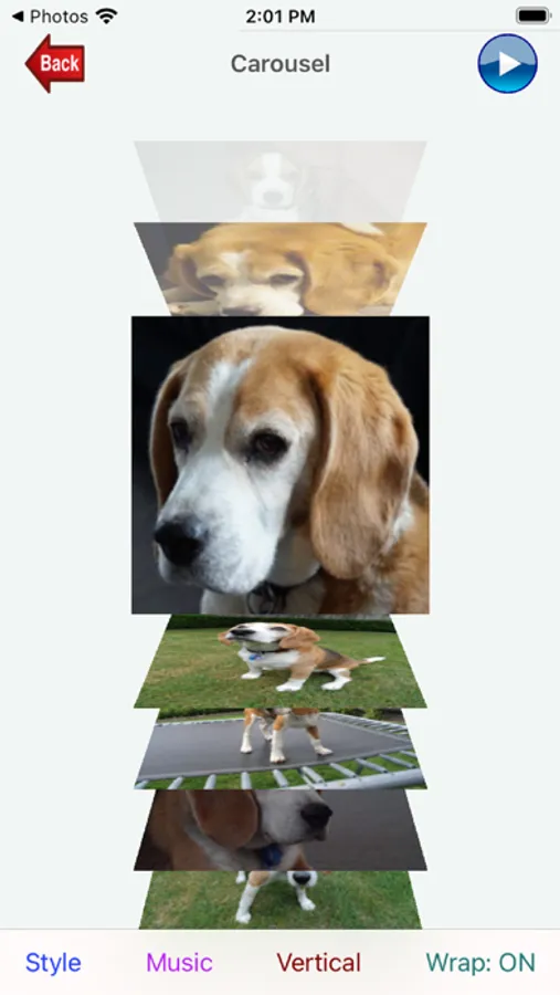 Carousel - Display selected photos in a carousel. There are two modes - manual or automatic and 12 carousel styles - Linear, Rotary, Inverted Rotary, Cylinder, Inverted Cylinder, Wheel, Inverted Wheel, Coverflow, Coverflow 2, Time Machine, Inverted Time Machine, Custom. You can run the carousel in horizontal or vertical mode with wrap-on or wrap-off. Music can be added from the music library. The music will play when the carousel is running.