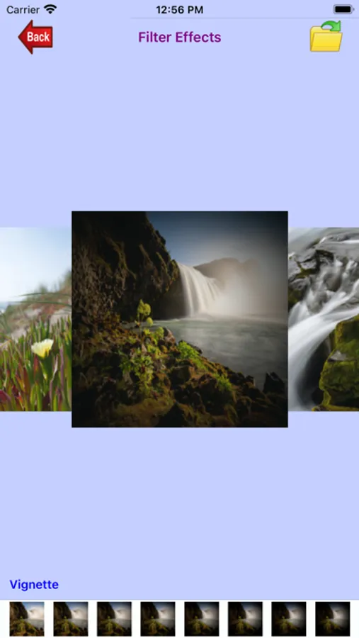 Filter Effects - Add filter effects to selected photos. Select from 32 filters - Bloom, Bump Distortion, Bump Distortion Linear, Color Control, Color Invert, Color Matrix, Color Monochrome, Color Posterize, Comic Effect, Exposure Adjust, Gamma Adjust, Glass Distortion, Gloom, Hexagonal Pixellate, Highlight Shadow Adjust, Hue Adjust, Photo Effect Chrome, Photo Effect Fade, Photo Effect Instant, Photo Effect Mono, Photo Effect Noir, Photo Effect Process, Photo Effect Tonal, Photo Effect Transfer, Pixellate, Sepia Tone, Sharpen Luminance, Twirl Distortion, Unsharp Mask, Vibrance, Vignette, Zoom Blur. A Slider is provided to allow you to adjust the filter.