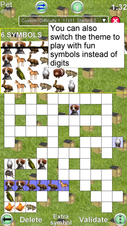 • Multiple difficulty options. Start with easy puzzles. Then change the settings to play more challenging puzzles.