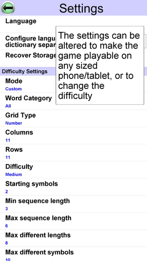 Each game is assigned a difficulty level from 0 (easy) to 9 (very hard). The difficulty level is determined by the settings. Each difficulty level maintains the high scores (measured by fastest time to complete the game). The game displays the best 20 scores for each difficulty level.