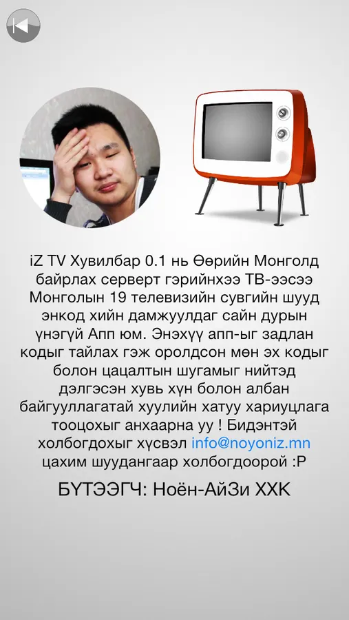 Ноён-АйЗи ХХК-аас санаачлан гаргасан үнэгүй апп болох iZ TV-ээр та бүхэн минь Монгол телевизүүдээ интернэтээр шууд үзэцгээж мөн манай кино санд байрлах кино, хүүхэлдэй, хошин шог гэх мэтчилэн зүйлсийг шимтэн үзэх боломжтой болж байгаа юм. Та бүхэн минь дэмжээд сайн үнэлгээ өгөөрэй :) Хүндэтгэсэн Г. Ирээдүй