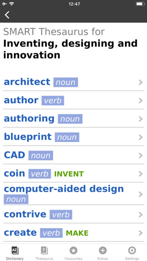 • SMART Thesaurus feature gives you related words and phrases at every definition, , not just synonyms