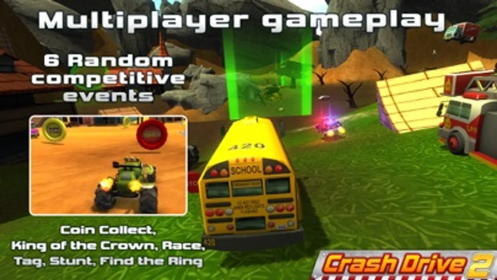 A sequel to the awesome off-road racing game Crash Drive 3D! Pick your car at the garage and get ready for some fun, mad, free-roaming driving experience.