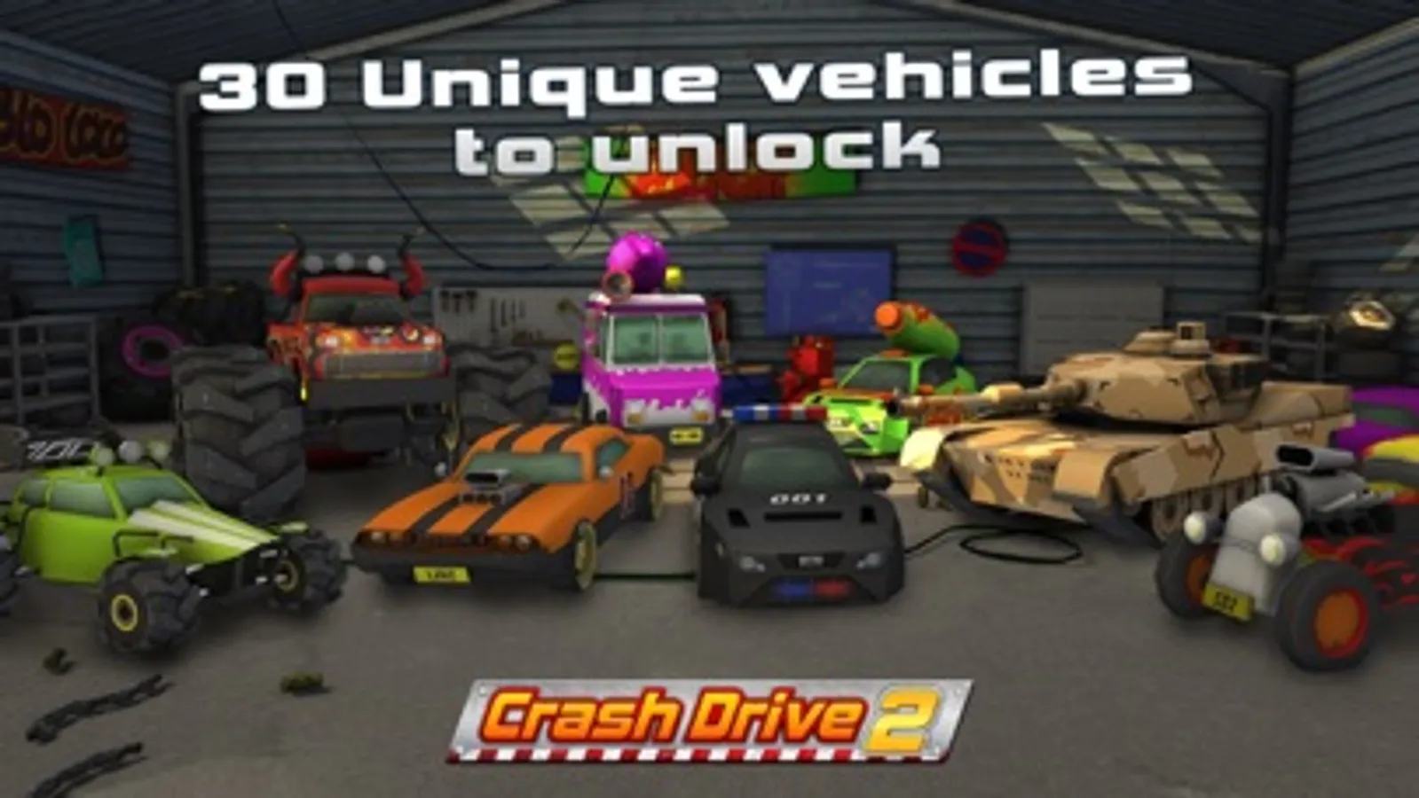 ⊗ 30 unique outrageous cars to unlock (like a School bus or a tank !)