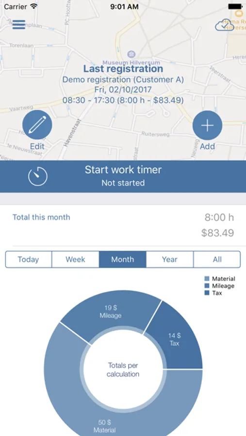 WorkReg allows you to easily register all your work hours. Besides the registering of work hours you can also register activities, used materials and mileage. The work registration can also be linked to customers and/or projects. WorkReg will always give you insight in total hours, total wage and total material costs.