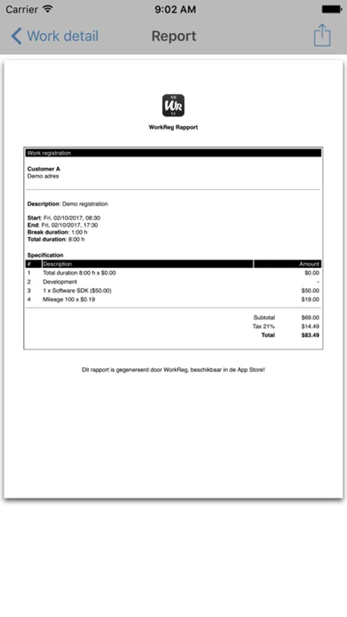 From WorkReg you can easily generate a report containing all important information about your work hour registration. This report allows you to filter by date, search criteria, customer and project. The report can be personalized by changing the header and footer of the report. You can choose from various export possibilities; Send by e-mail, export to Dropbox or print to an AirPrint-enabled printer. In both email and Dropbox exports an PDF and an CSV file is included that you can use in Excel. Also all export files are stored on the iOS device itself, these files can easily be transfer from iTunes to your computer.
