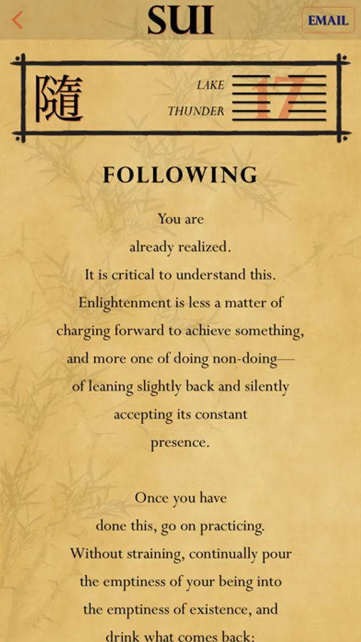 The text is configured as an oracular text, just like the I Ching, to facilitate concentration upon a particular teaching with respect to a specific question. It centers primarily around wei wu wei, the ancient Taoist notion that translates roughly to “doing not-doing”. By whatever name or not-name, this practice is the core teaching of every enlightenment tradition in the world.