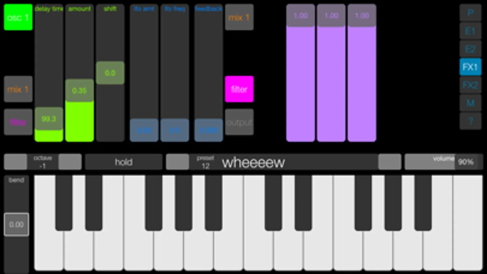 - Effects section: two channels of delay + frequency shifter with feedback with some flexible routing. Also includes basic reverb