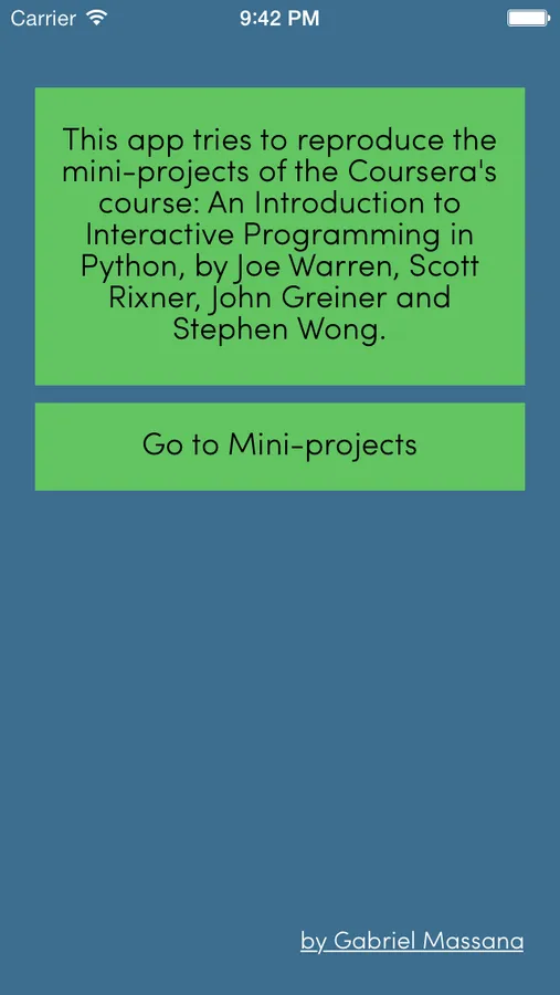 This app tries to reproduce the mini-projects of the Coursera's course: An Introduction to Interactive Programming in Python, by Joe Warren, Scott Rixner, John Greiner and Stephen Wong.