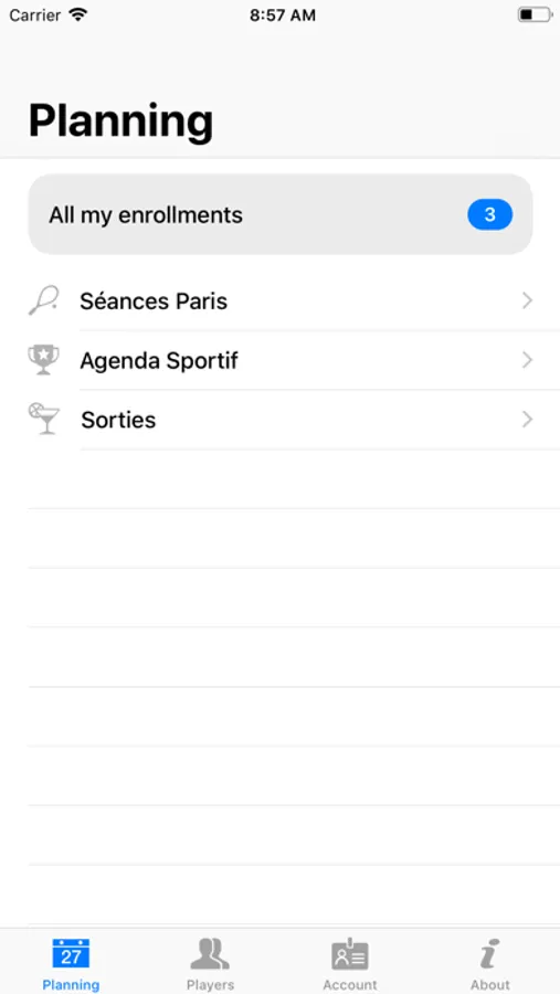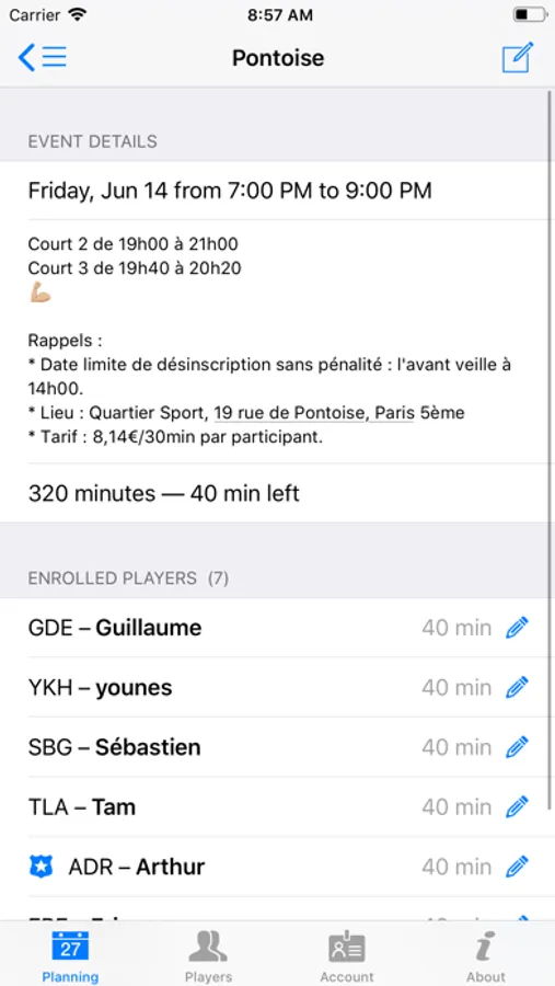 - view the available slots for a squash session and the reservations you've already made, as well as the incoming events proposed by Les Petites Frappes