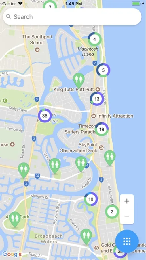 Access GC provides information about disability services on the Gold Coast. It currently displays disability carparks, toilets, access ramps, hotels, restaurants, . Colour-coded clusters indicate the types of services within a cluster. Data is provided by City of Gold Coast through their Open Data initiative. Also included are outlines of carparks and toilet facilities.