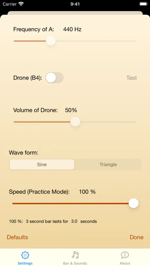 • Play the B4 drone (volume, frequency of A and wave form are all selectable).