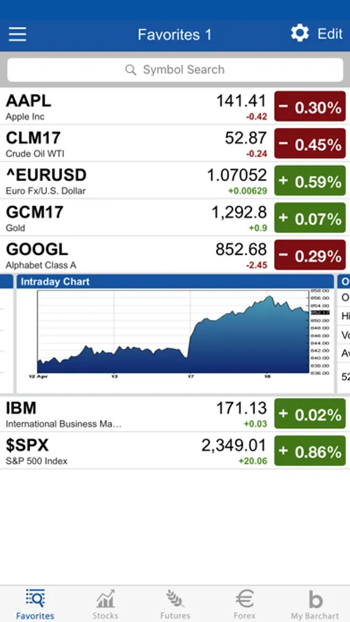 Barchart Stocks, Futures and Forex is the most complete financial app currently available. Track stocks, futures, forex markets, ETFs & indices. In-depth coverage on all symbols (including charts, technicals, fundamentals, opinions) is available at your fingertips on our advanced multiple Favorites lists, making it easy for investors and market followers to track and watch the markets.