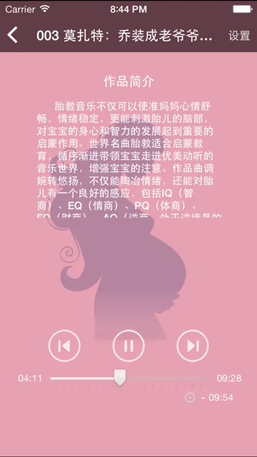 聪明宝宝胎教音乐曲调婉转悠扬,不仅能陶冶情绪,还能对胎儿有一个良好的感应哦,从IQ(智商)、EQ(情商)、PQ(体商)、FQ(财商)、AQ(逆商,处于逆境是的处理能力),孕妈妈科学合理胎教,可以孕育一个聪明的宝宝哦!