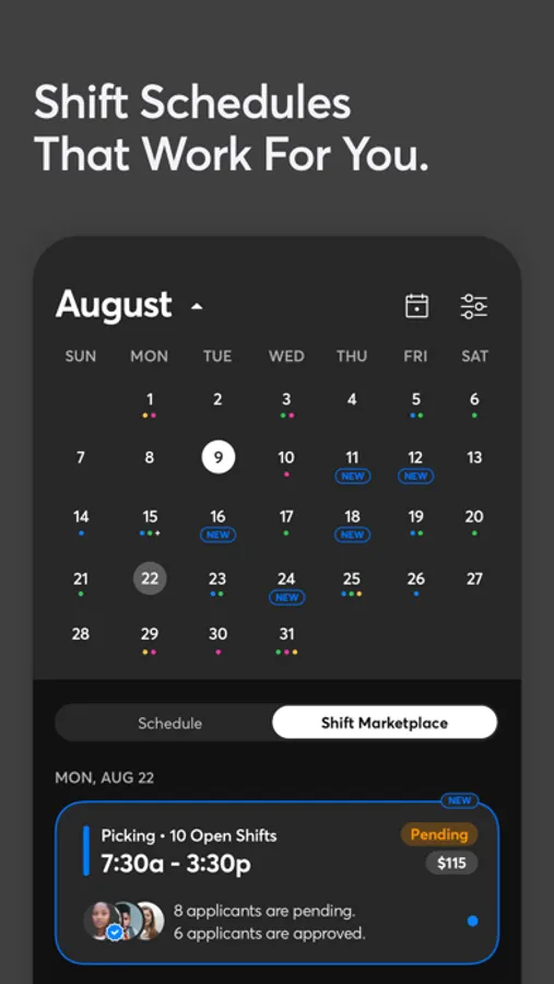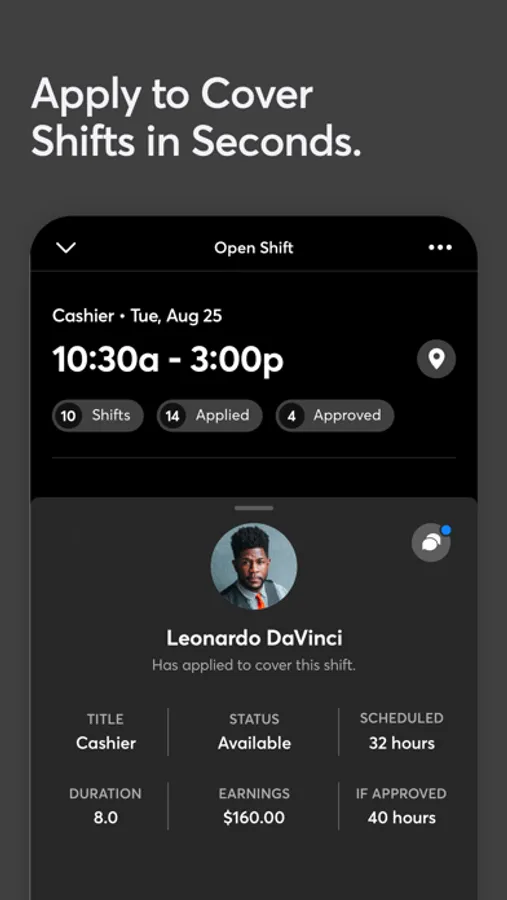 Looking to earn extra income? Pick up shifts by browsing available work opportunities on the Shift Marketplace. Tap on a shift to apply. Once you are approved, head in to work!