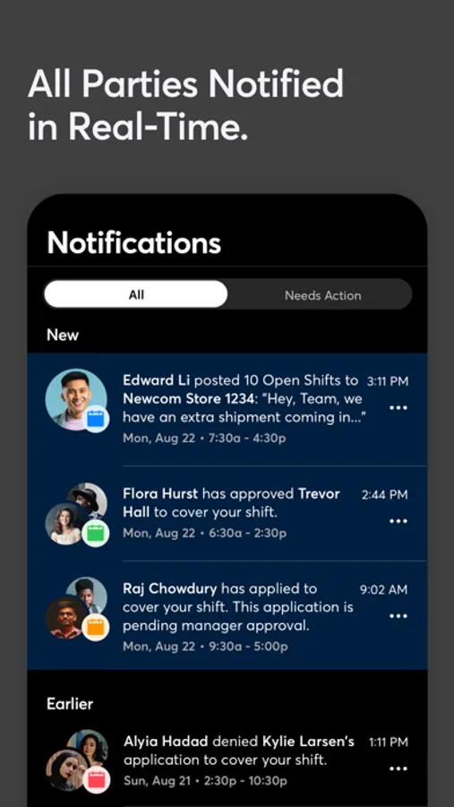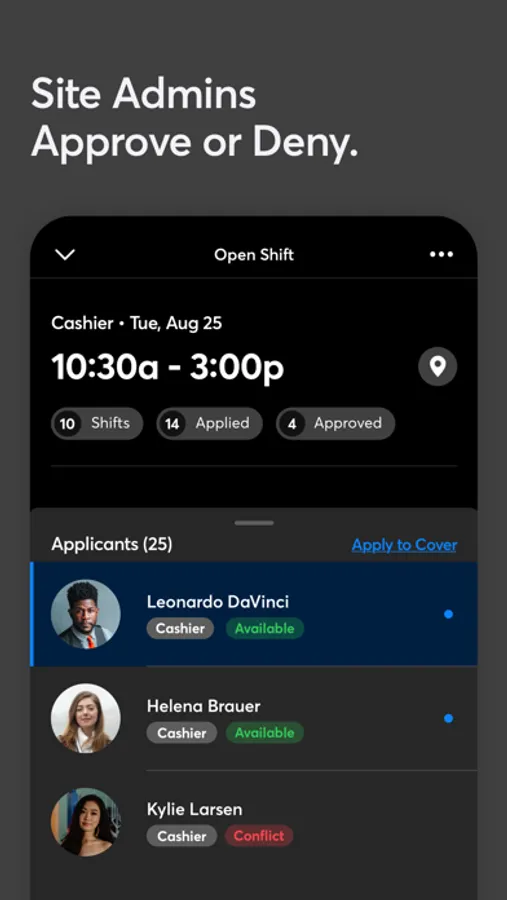 Review and approve or deny shift swap applications between team members, and for manager posted shifts. Manage multiple applications all on one shift card.