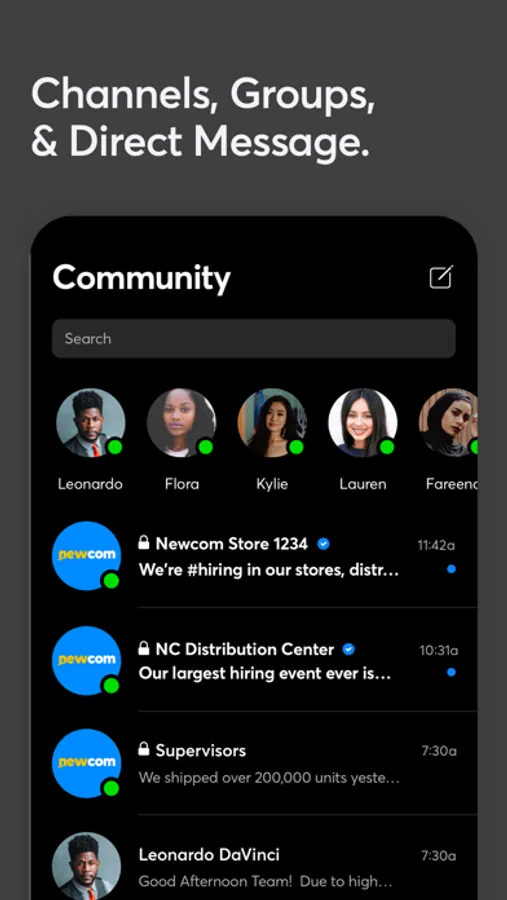 Stay connected without trading phone numbers with your coworkers. Access the Community tab to send direct messages or post multimedia on team channels.