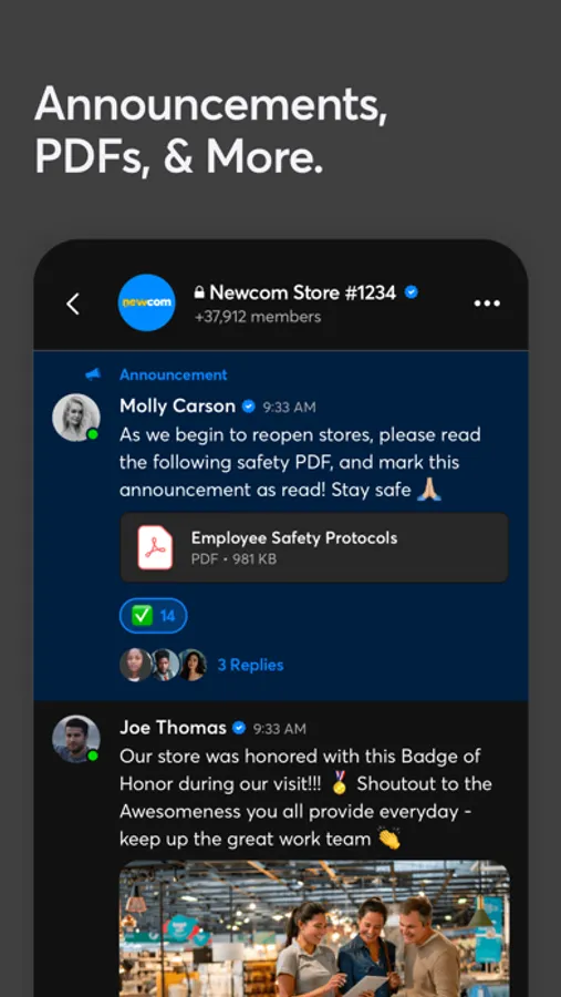 Post announcements with read receipts. Send announcements to your location on a team channel, and see who has marked the announcement as read.