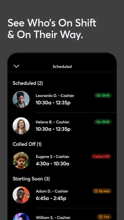 Access and manage your work schedule on your mobile device. View shifts you are working, all shift details, and get push notification reminders before each shift.