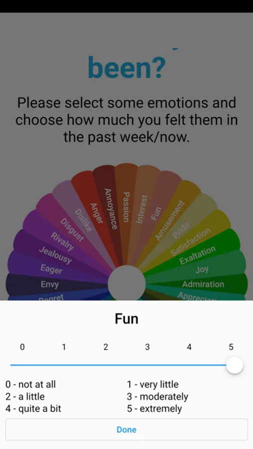 MoodWheel is an educational instrument developed based on a research project meant to help you become aware of the levels of your unhelpful and unhealthy negative emotions and thoughts. MoodWheel was developed to help you become aware of your unhelpful and unhealthy negative emotions and thoughts, and is based on the Rational-Emotive and Cognitive-Behavioral Therapy approach.