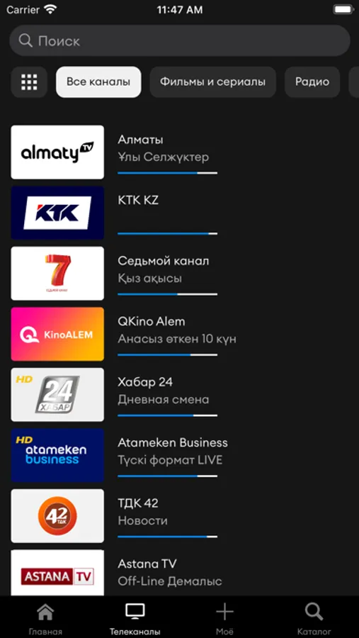 просмотр казахстанских и зарубежных телеканалов в режиме реального времени;