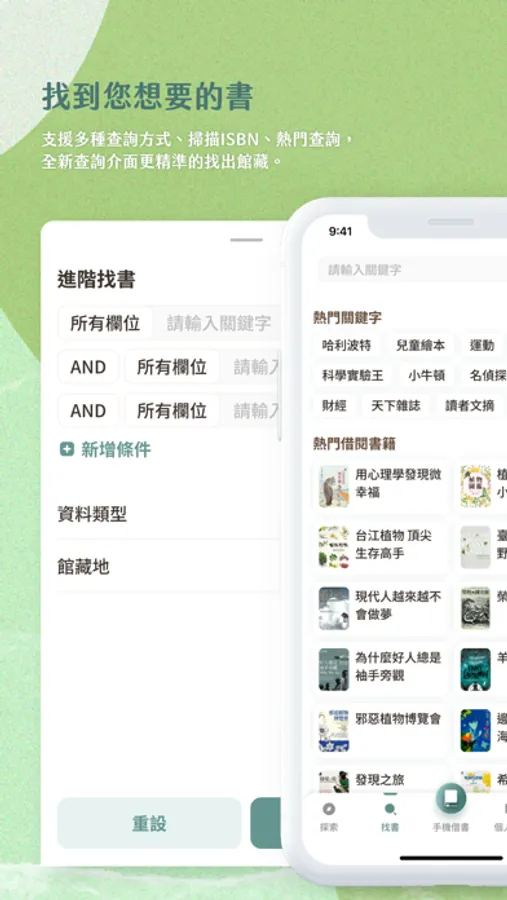 輸入關鍵字即可查詢館藏,支援邊輸入邊查找,只要輸入部分書名便會即時列出符合條件的書籍。同時提供進階找書功能,可一次新增多個條件、類型、館藏地等,更精確的找到您所要的館藏資源。另外,亦可直接掃描書籍的 ISBN 條碼,快速查詢書籍詳細資訊。