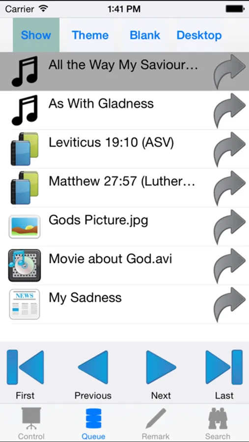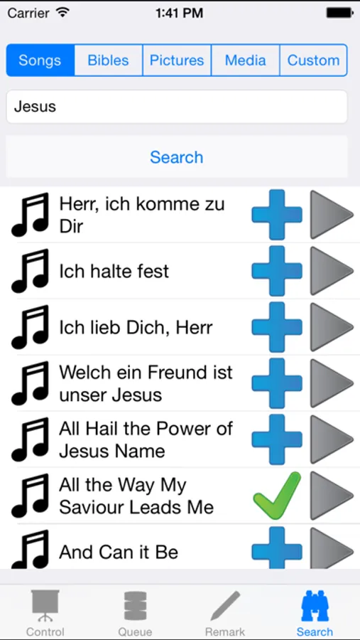 * Search you Databases (Songs, Bibles, Pictures, Media, Custom - and add them to Queue / Start it directly on Screen
