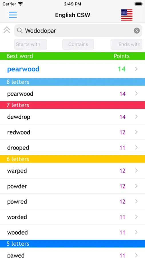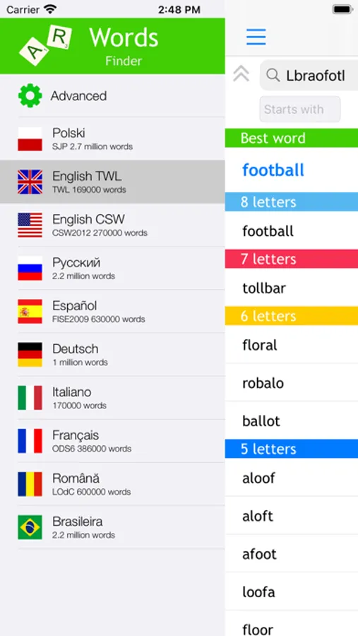 This is the easiest and the fastest way to find words containing given letters. The application is very useful and helpful with every type of Words Games. It contains dictionaries of 10 languages: polish, english TWL, english CSW, russian, spanish, german, italian, french, romanian, portugese. Every found word can be easly checked in the online dictionary.