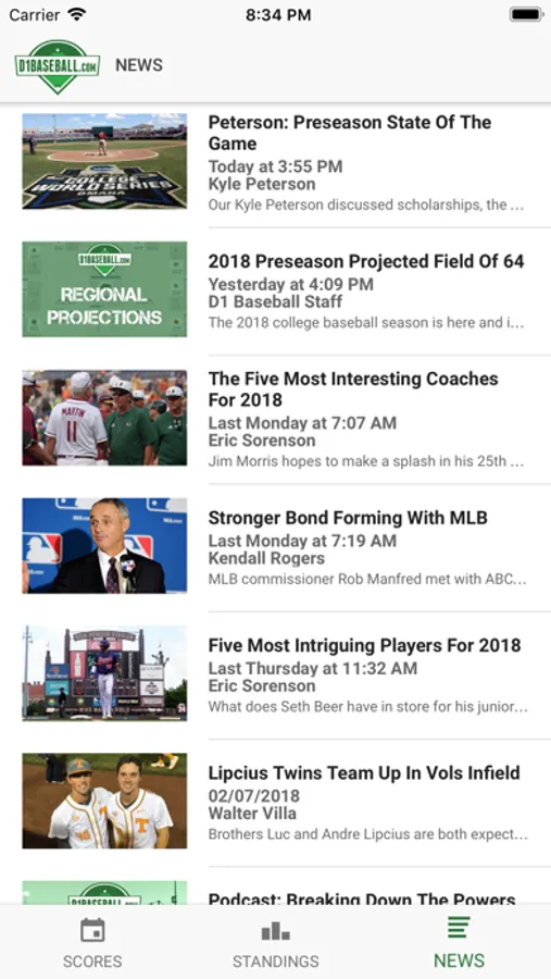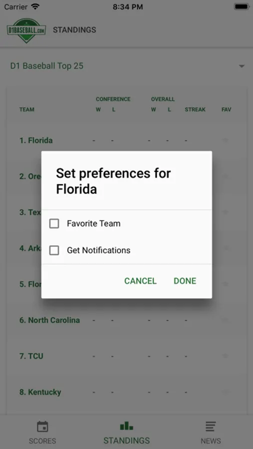 This subscription enables use of the D1 Baseball app which provides up-to-date scores, standings, and schedules for Division I College Baseball. Once subscribed, you will be able to view information about your favorite Division I College Baseball teams. While viewing team standings, by conference, you can select teams as favorites. Games for your favorite teams will show up first in the scores view. You can also receive alerts, in the form of push notifications, for selected teams.