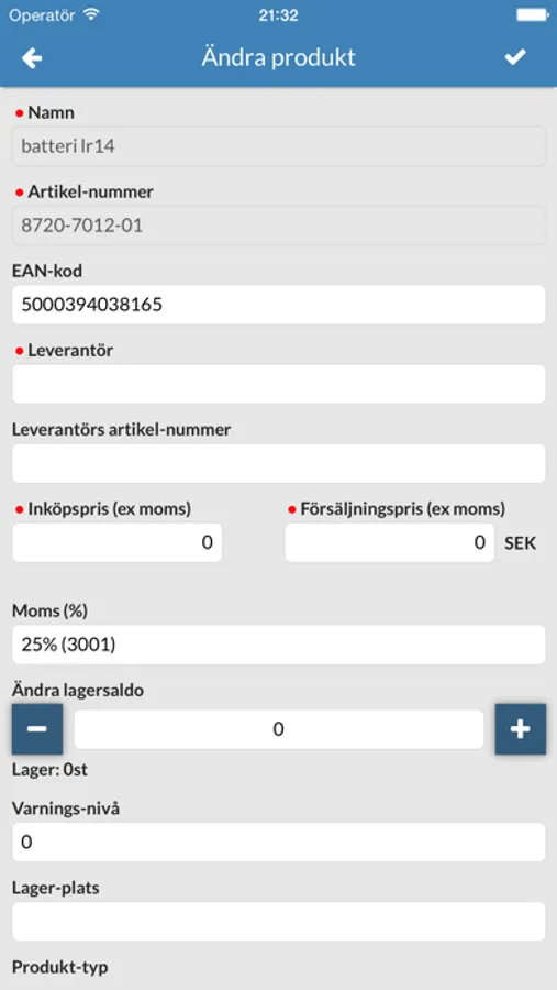 You can use the camera of your phone to read bar codes, or connect a bar code reading accessory when you check articles etc. It is also possible to enter article data manually, such as article number or the name of the article.