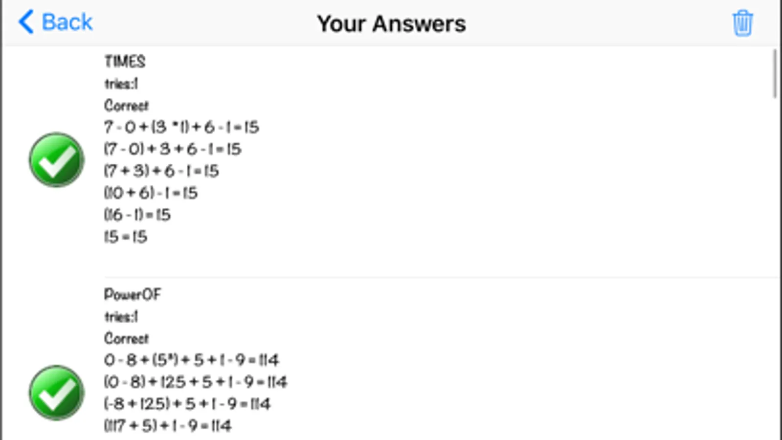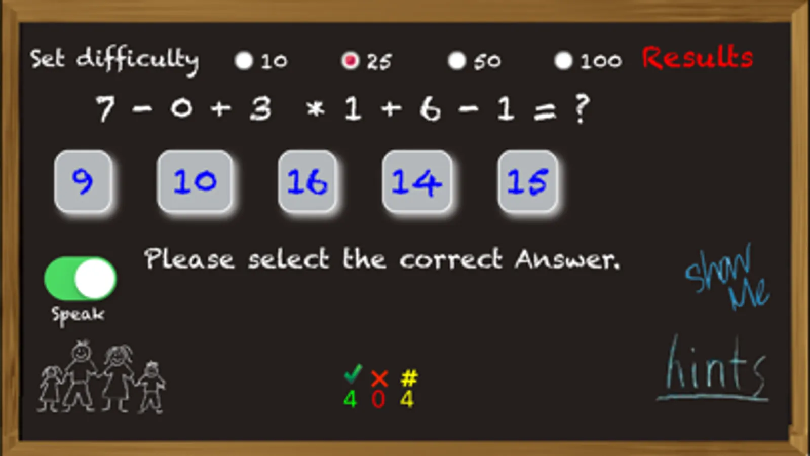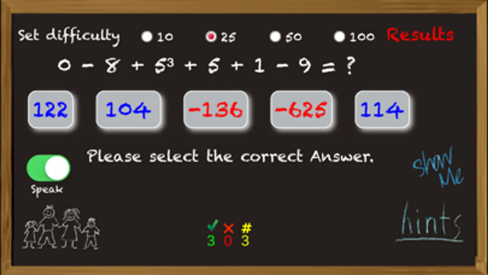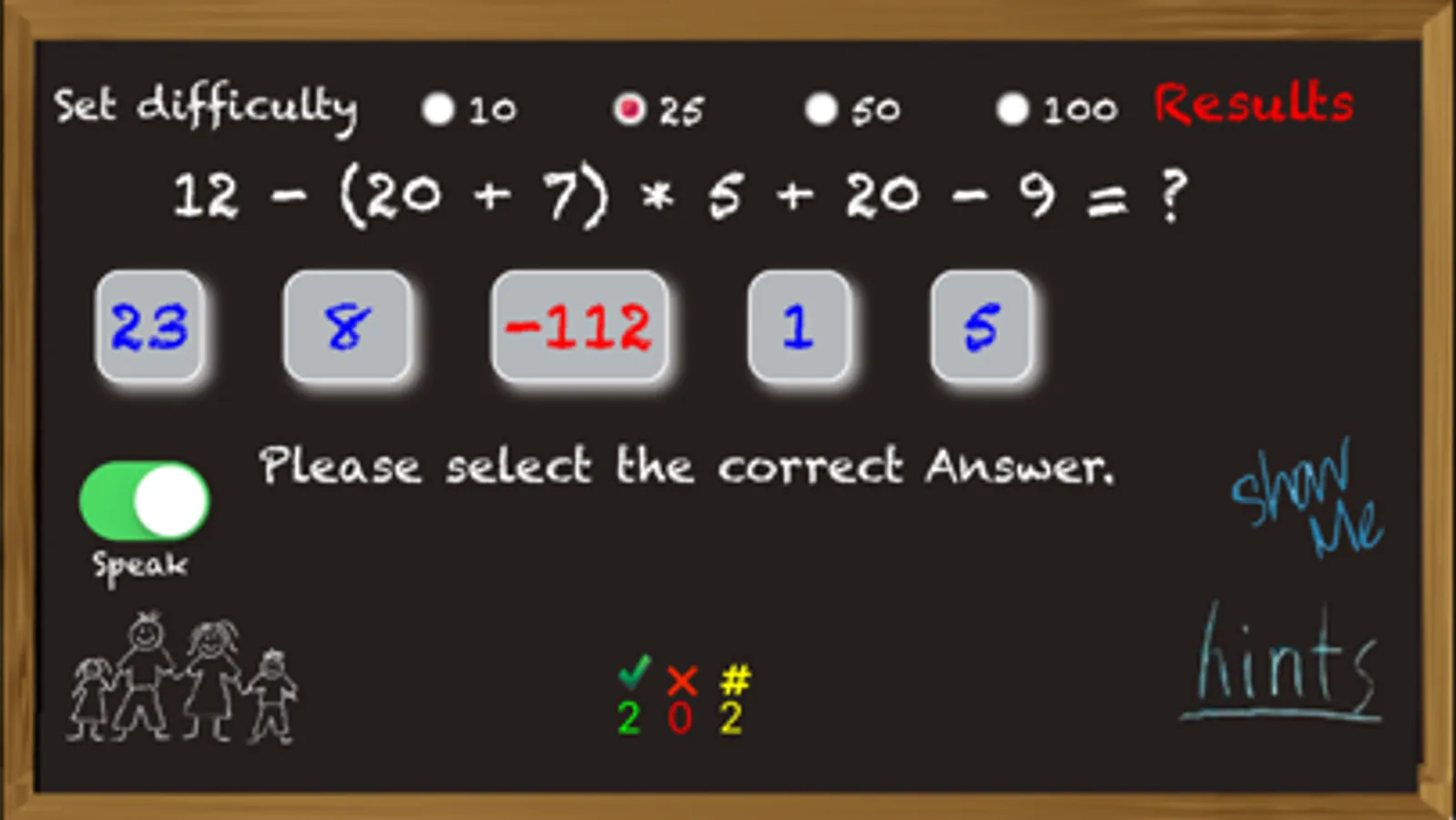 Using multi choice with hints so you can learn the rules of this kind of math. The formula is even spoken to you. Add, subtract, multiply, divide, Exponents, Parenthesis. Learn the proper order. Please Excuse My Dear Aunt Sally.