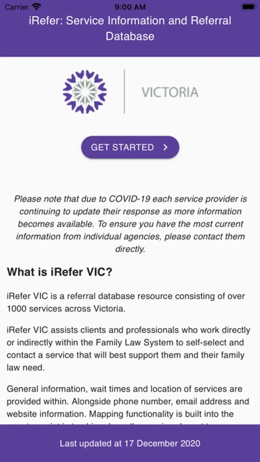 HOW DOES IT HELP? iRefer Vic enables you to find those programs and services that can make a difference. Easily identified categories group service providers together. Alternatively, you can search by typing applicable words in the search field, e.g. ‘dispute’, ‘Mildura’, or ‘education’. Every effort has been made to provide information that is timely and accurate. Users are encouraged to synchonise frequently to get the latest information on items such as ‘eligibility’, ‘fees’, ‘waiting times’, and ‘referral process’. You can locate the agency on a map, call, email or access the website for further information.