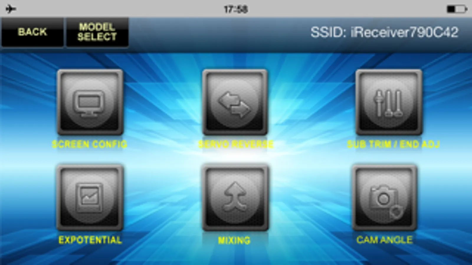 The iReceiver supports more than 40 model memory slot, trim adjustment, control mode selection, end point adjustment, servo reversing, servo mixing, exponential, camera image vertical flipping, still camera function, video recording function, and stopwatch function.