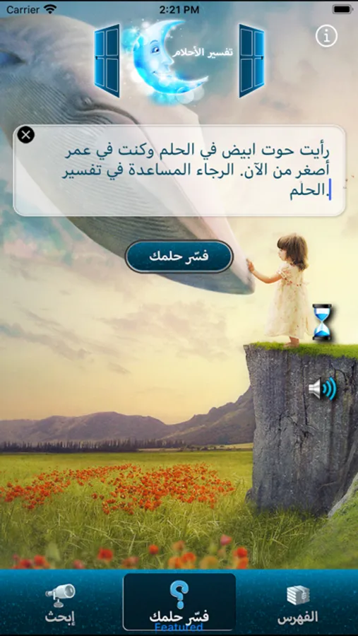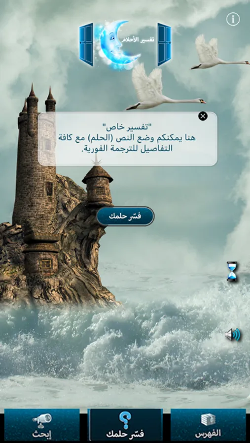 - أو تفسير خاص، حيث يمكنك إرسال أي فكرة أو حلم إلى المتخصصين في تفسير الأحلام. وسوف يصلك تفسير للحلم في دقائق, ارسل الحلم ومن ثم اغلق التطبيق و بعد عدة دقائق يمكنك ان ترى الجواب في صفحة الأسئلة السابقة.