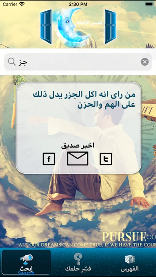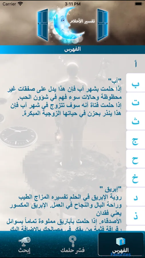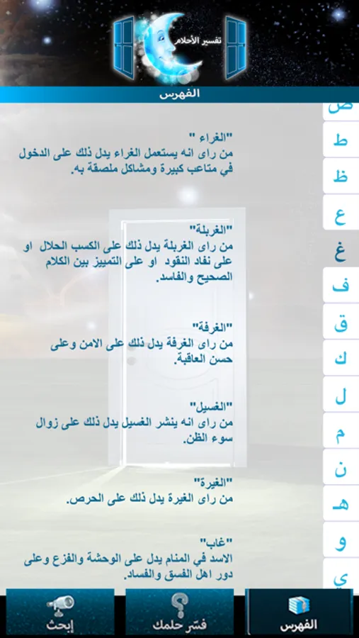 - الفهرس: حيث يمكنك تصفح كل الاحلام وإجاباتها.