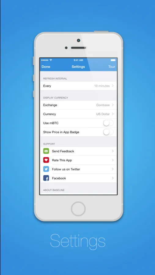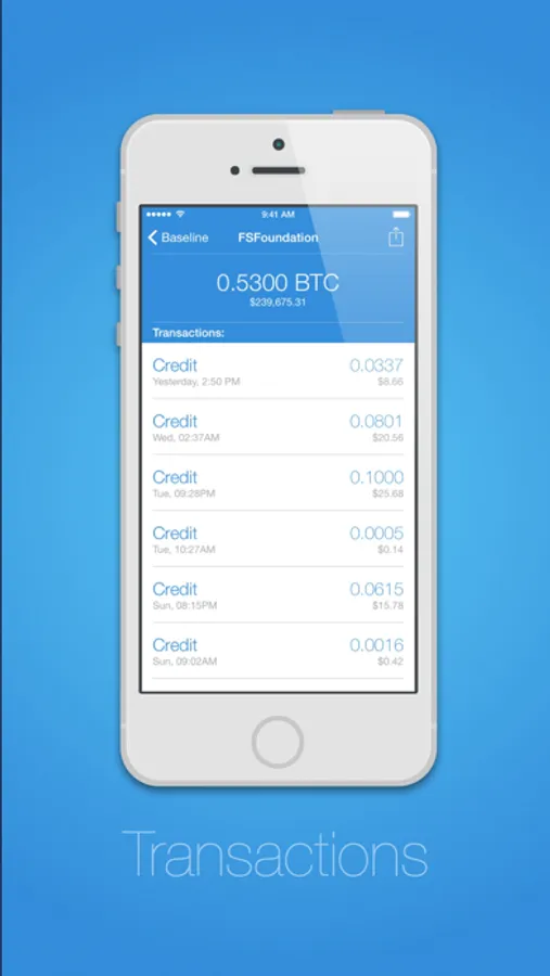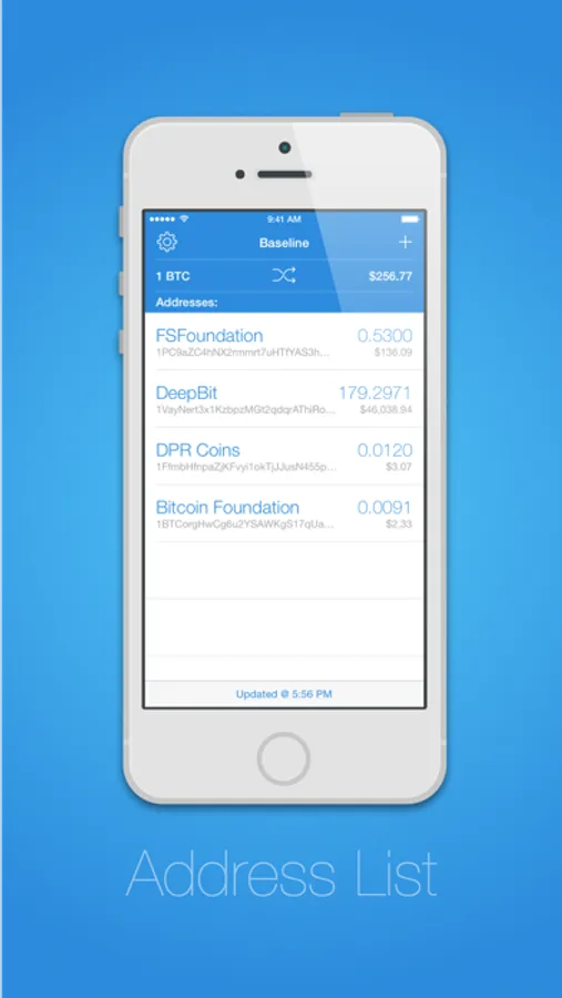 Baseline lets you keep track of Bitcoin addresses on your iPhone. See balances and transaction history at a glance. Conveniently toggle the display currency between Bitcoin and over 50 supported Fiat currencies.