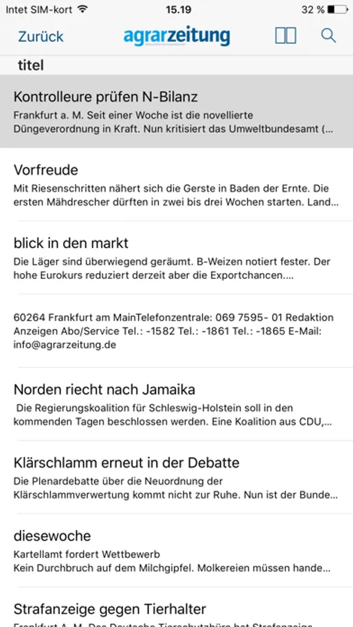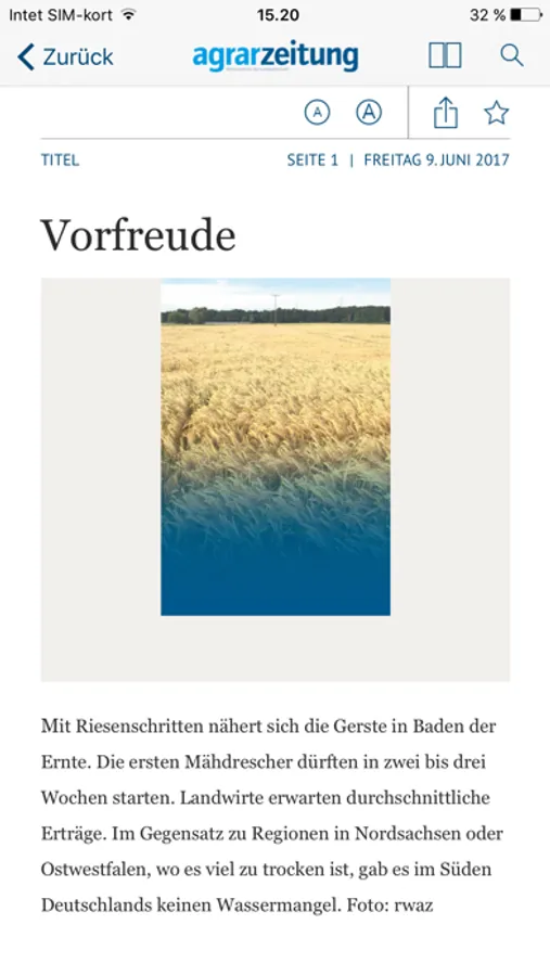 Sie ist einfach und bequem zu lesen: In der Originalansicht lässt sich die ’agrarzeitung’ per Fingerwisch durchblättern und per Fingerzug heranzoomen. Eine Suchfunktion ermöglicht die Stichwortsuche über die komplette Ausgabe und im App-Archiv. Jeder einzelne Artikel kann angetippt werden und erscheint in einem skalierbaren, übersichtlich gestalteten Lesemodus im Hoch- und Querformat. Hier können auch Bildgalerien betrachtet werden.