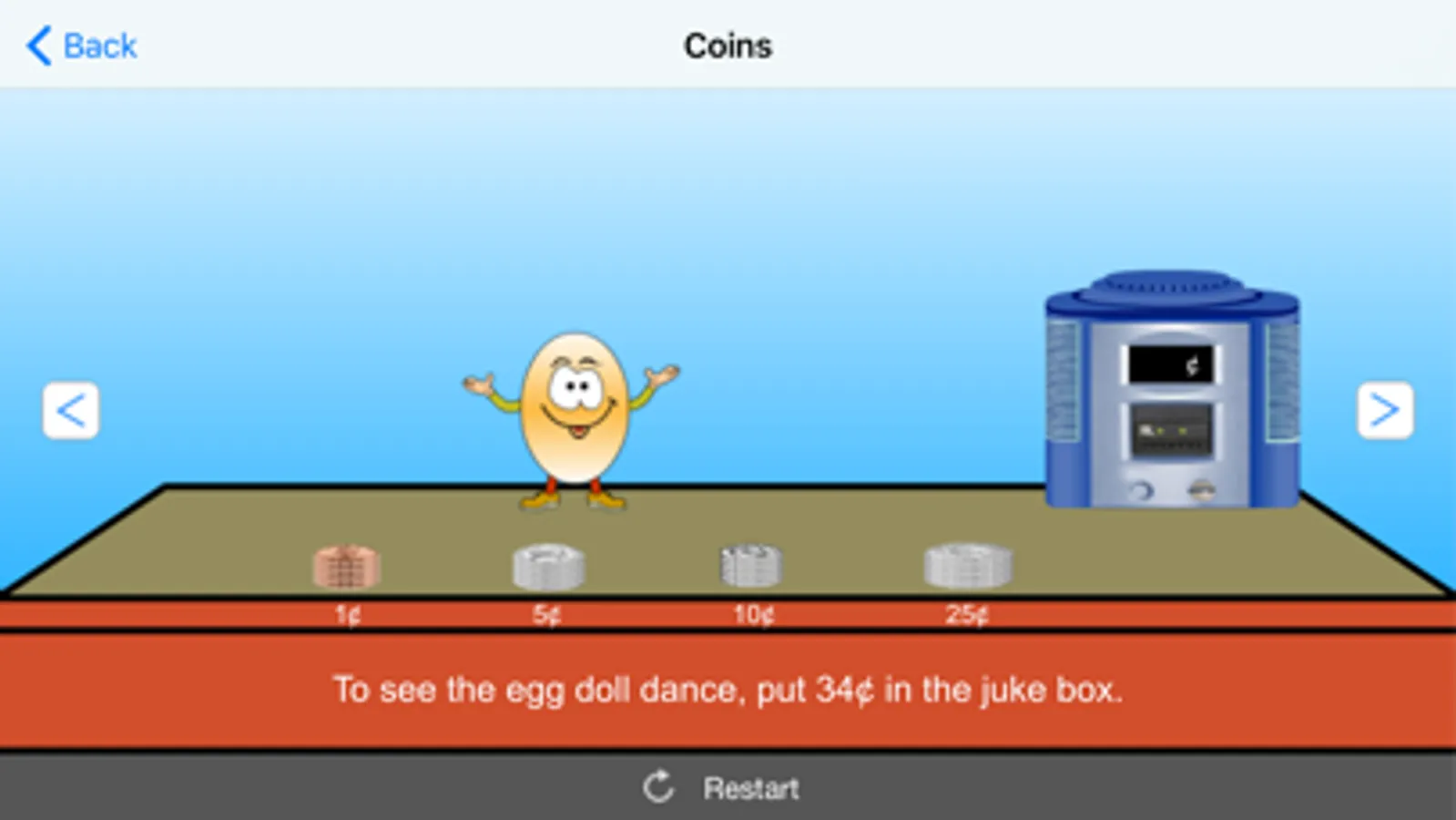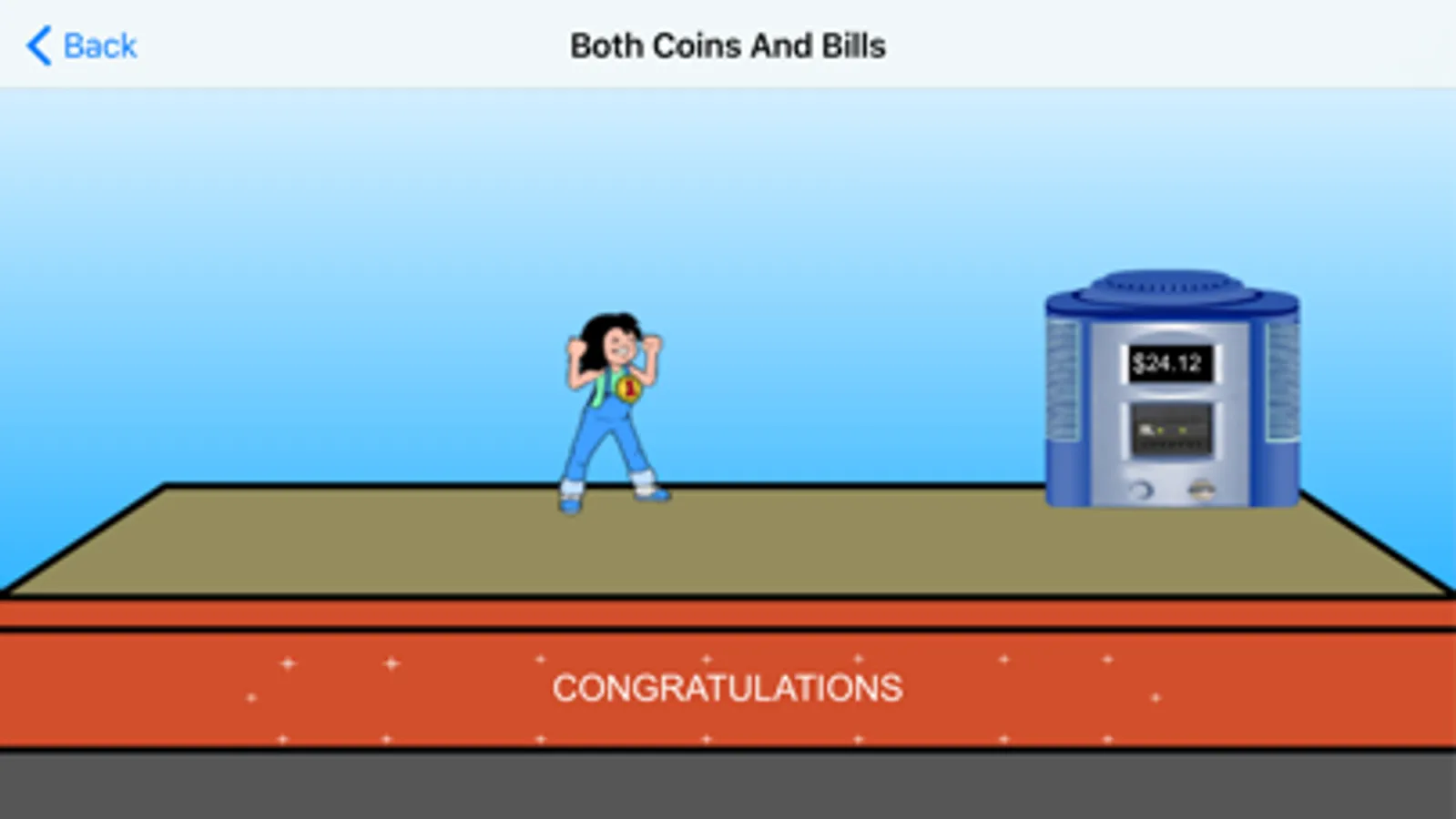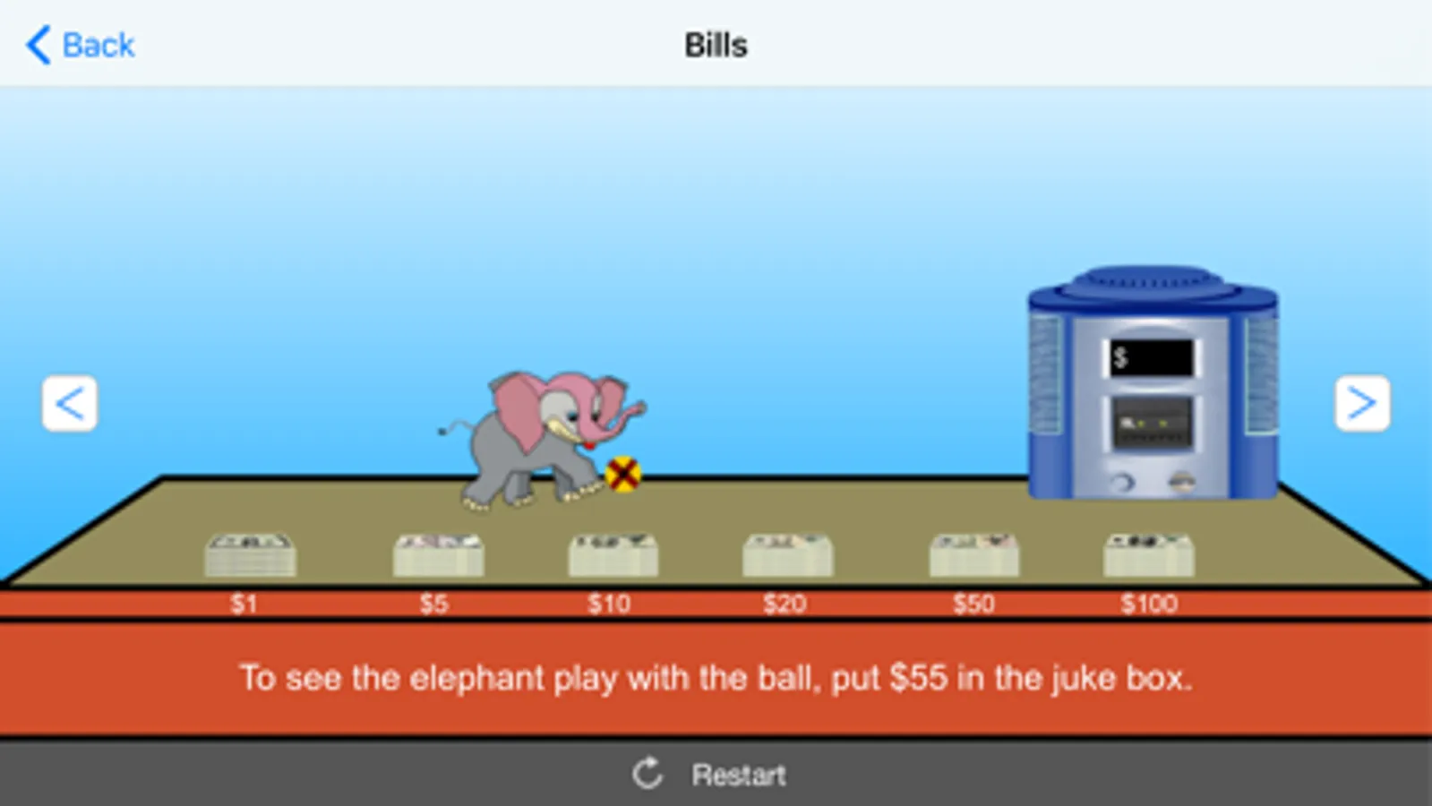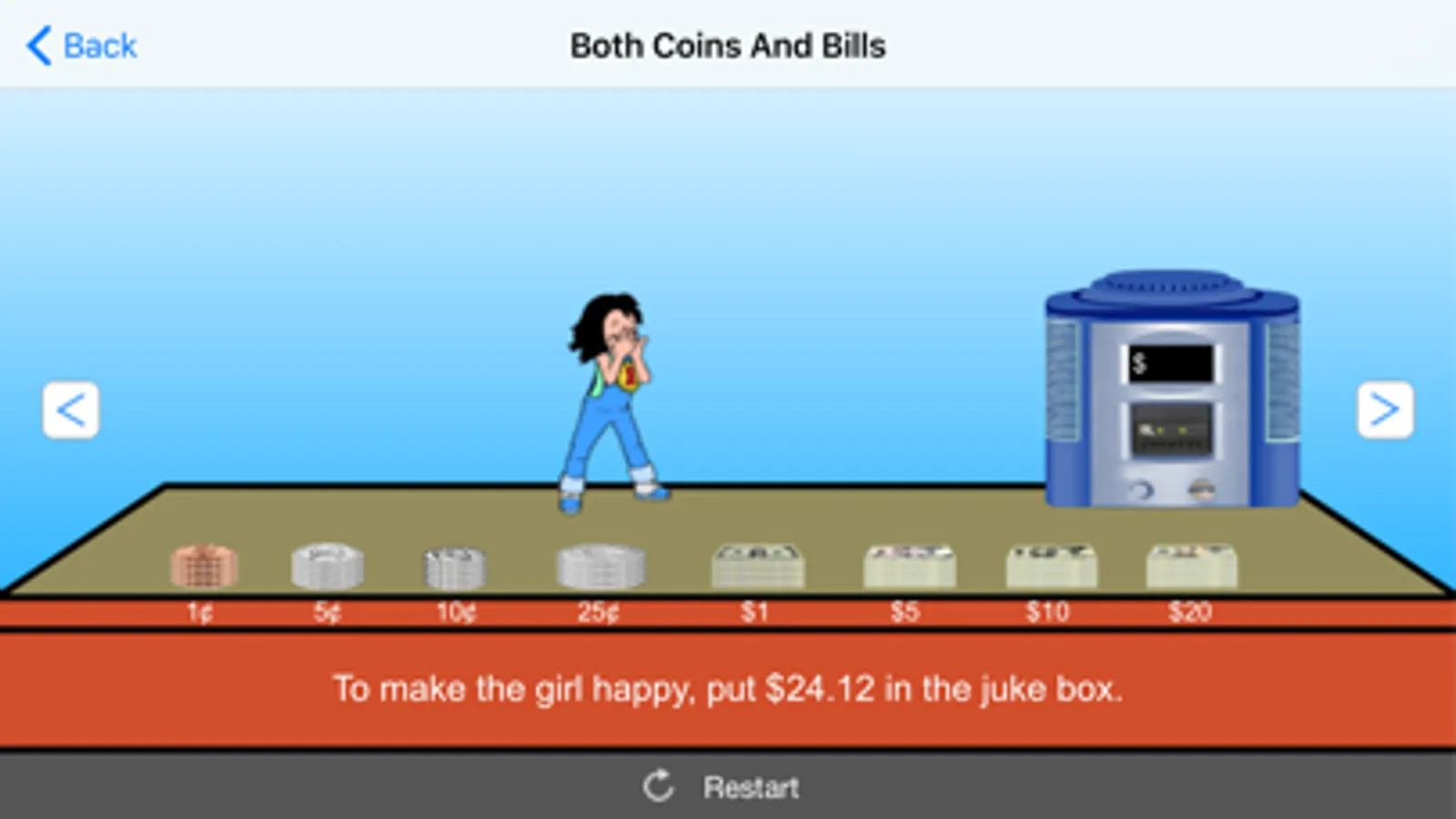 This app helps the student to learn to use coins and/or bills to make a particular amount. A picture of (for instance) a clown appears on a platform next to a juke box. The computer voice and a line of text on the front of the platform say “To see the clown dance put (for instance) 66¢ in the juke box." There are stacks of coins and/or bills on the platform in front of the clown. When the student Touches on one of the stacks a coin or bill from the top of that stack flies into the slot in the front of the juke box, and the display that shows the amount that has been put into the juke box changes to show the current value of the money that has been put into the juke box. When the juke box display reaches the correct value (66¢) the clown dances. If the student puts too much money into the juke box, the computer voice and the text on the front of the platform say “Oops! That is too much money. Let's try again."