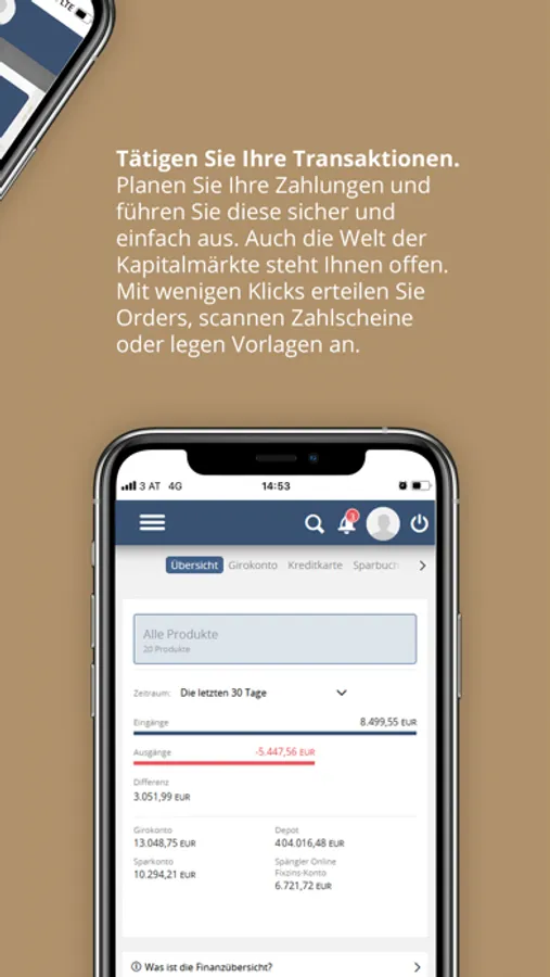 • Ihre Finanzen auf einen Blick: Sehen Sie Ihre Girokonten, Sparprodukte, usw. auf einen Klick