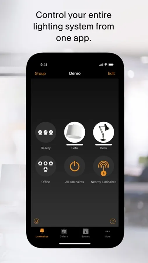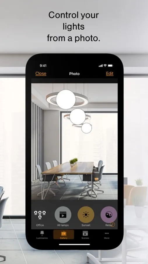 The app allows you to control lighting visually from a photo. Simply take a photo of the room in which the lights you wish to control are, upload it to the Gallery, and drag the desired control commands over the lighting fixtures within the picture. No need to remember which luminaire is which, you have a visual guide for decision-making ease.