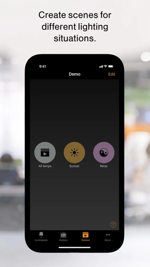 The Scenes tab allows you to create and recall personalized lighting set-ups. One scene can control any variation of luminaires in your network, and luminaires can be used in multiple scenes. From simple lighting scenarios (such as circadian or daylight scenes) to animated and timed scenes, virtually any set-up can be configured, saved, and recalled in the app.