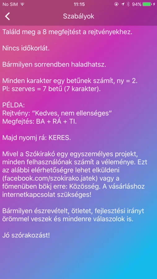 A Szókirakó egy egyszemélyes projekt, amelyben mindenkinek a véleménye számít. Így, ha bármilyen észrevételed vagy ötleted van, akkor várom az üzenetedet ezen az oldalon: facebook.com/szokirako.jatek . Minden megkeresésre válaszolni fogok. Szeretném bővíteni a játékot és erre bármilyen ötletet szívesen veszek, úgyhogy hajrá!
